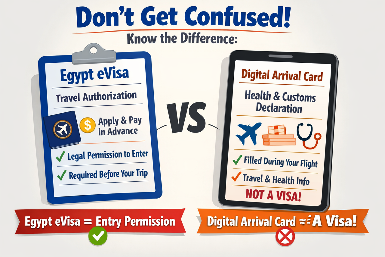 It’s easy to get confused! An Egypt eVisa is your legal permission to travel to Egypt, which you need to apply for and pay for in advance of your trip. A Digital Arrival Card, if required during your flight, is simply a health or customs declaration, which allows the government to know your stay requirements and health status, but this is not a visa!