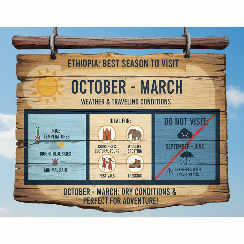 - Best Season: the time from October to March is regarded as the best period for visiting Ethiopia.