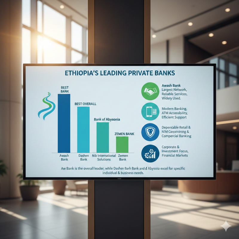 Among all the private banks in Ethiopia, Awash Bank is the best overall and the others like Dashen and Abyssinia are great depending on individual or business requirements.
