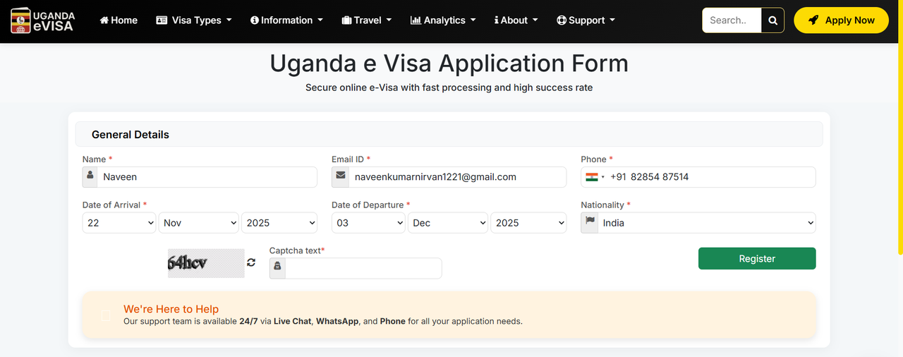 - Complete the Uganda eVisa application form with your travel and personal details.