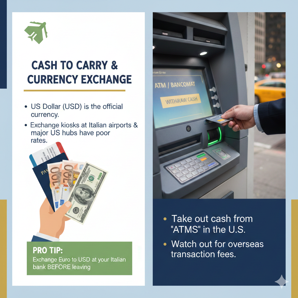 - Pro Tip: Make a small exchange from Euro to USD at your local Italian bank before you leave.