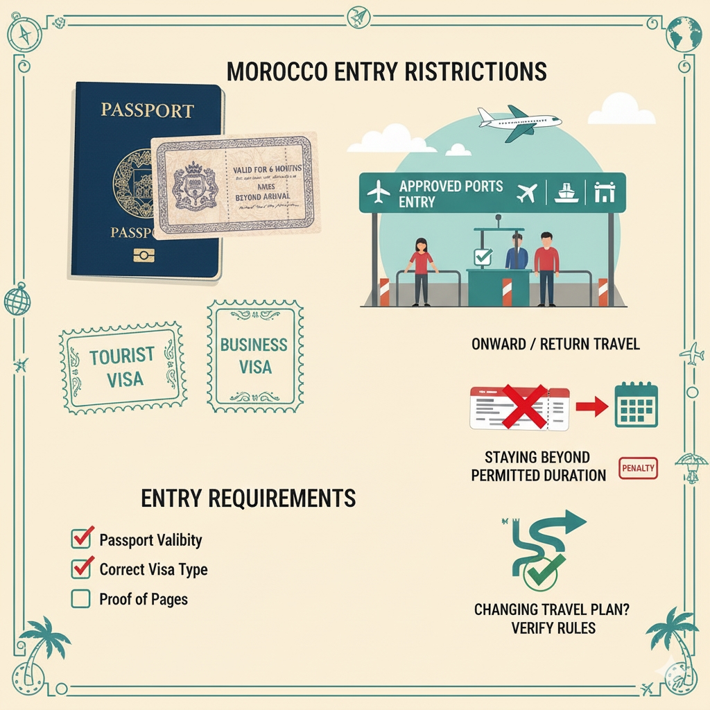 If you change your travel plan (e.g., stay in Morocco longer, enter from unusual point, take up work) you must verify rules in advance.